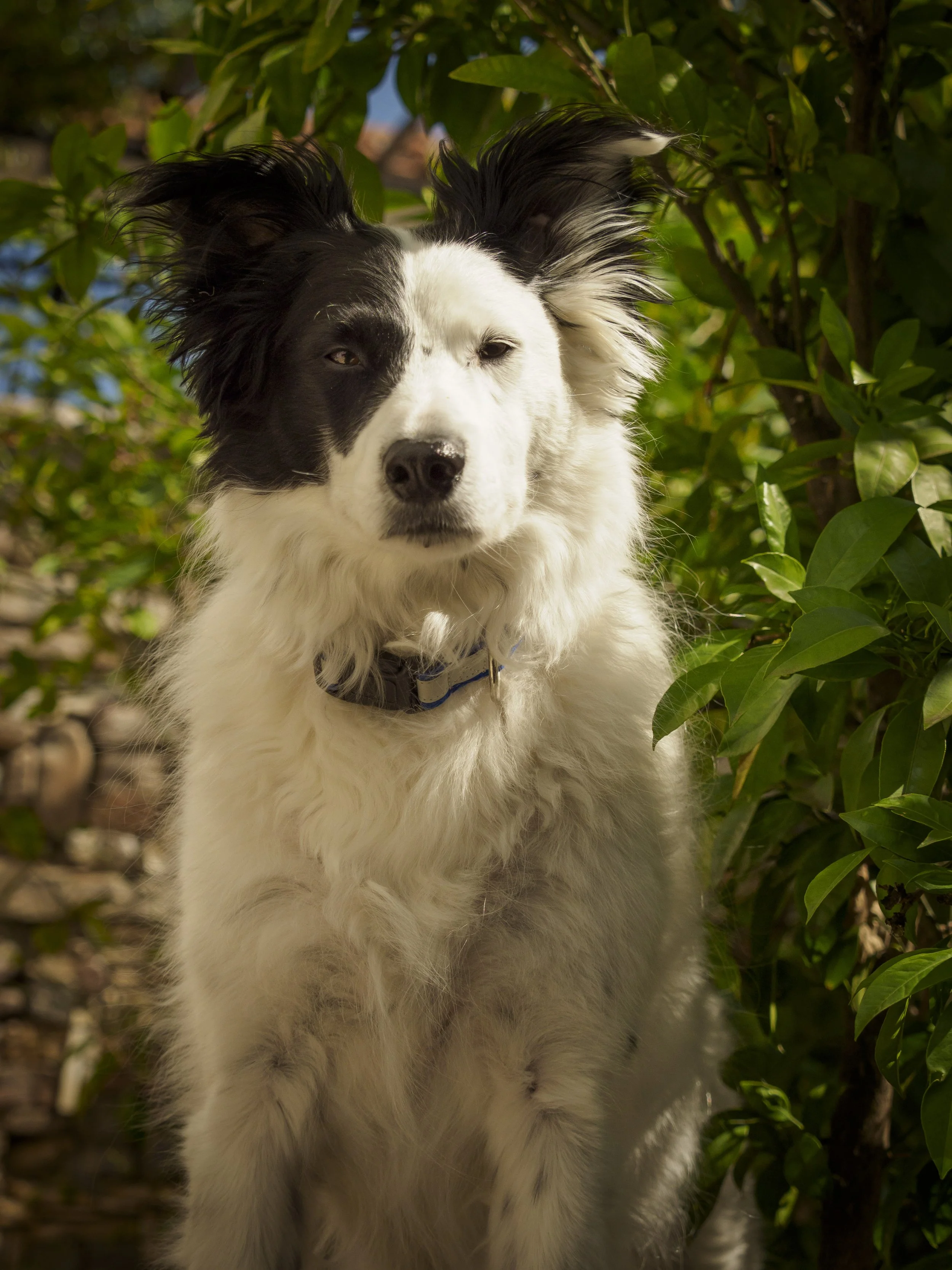 Here Ozzie is standing on a patio above me. I happened to notice him in this bush and put him in a sit/stay. He's used to being asked to model so is compliant. I like how the foliage and lighting frame him. Dang, he's a handsome devil, isn't he?